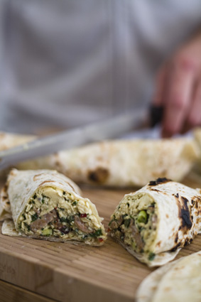 When I first went surfing in Malibu, I saw all the surfers lined up to get their breakfast burritos after a morning on the waves. Those burritos were so delicious that I worked out how to make them for myself. If you’ve had a strenuous start to the day, this is the perfect protein payback.