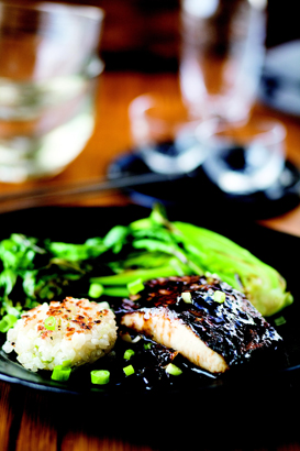 Teriyaki Black Cod with Sticky Rice Cakes and Seared Baby Bok Choy