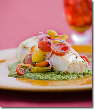 Halibut is my favorite white fish: It is simple to prepare and the perfect canvas for vibrant flavors. The habaneros, used here in moderation, add just enough heat to make this interesting. The cucumber-cilantro sauce adds a fresh finish to this colorful dish.
