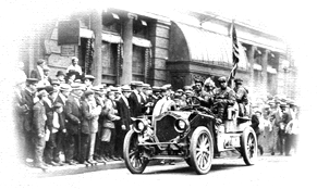 Among the heroes of the race were two men who ultimately transcended the others in tenacity, skill, and leadership. Ober-lieutenant Hans Koeppen, a rising officer in the Prussian army, led the German team in their canvas-topped 40-horsepower Protos. His amiable personality belied a core of sheer determination, and by the race’s end, he had won the respect of even his toughest critics. His counterpart on the U.S. team was George Schuster, a blue-collar mechanic and son of German immigrants, who led the Americans in their lightweight 60-horsepower Thomas Flyer. A born competitor, Schuster joined the U.S. team as an undistinguished workman, but he would battle Koeppen until the very end. Ultimately the German and the American would be left alone in the race, fighting the elements, exhaustion, and each other until the winning car’s glorious entrance into Paris, on July 30, 1908.