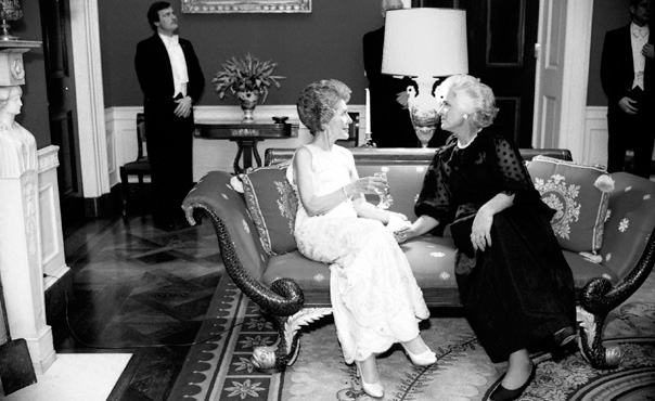 Nancy Reagan and Barbara Bush, January 27, 1981, a week after the inaugural. Their relationship was publicly cordial but privately corrosive. During their eight years in the White House, Mrs. Reasan never invited the Bushes to the family quarters. Reagan's biographer Edmund Morris said, "Barbara never forgave Nancy for treating them like the help."
