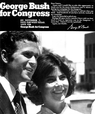 The 1978 campaign poster for George W. Bush with his new bride, Laura Lane Welch, from Midland, Texas. They spent their honeymoon driving around West Texas as George sought to win a seat in the House of Representatives. He lost to his Democratic opponent, Kent Hance, who switched parties years later and supported Bush when he ran for governor.