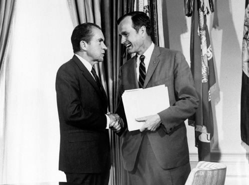 President Richard Nixon shaking hands with George Herbert Walker Bush. As a one-term congressman, Bush angled to become Nixon's running mate in 1968. After Bush gave up his House seat to fight a second losing campaign for the Senate in Texas in 1970, Nixon launched him on his career as a presidential appointee. Bush said about his first politcal mentor: "[H]e appointed me to the United Nations and he saw me as a man with prospects in the Republican Party."