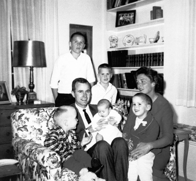 The Bush family in Houston, Texas, in 1959. Seated left to right: Neil, George a.k.a. "Poppy" Bush, holding baby Doro, Marvin, and Barbara. Standing: George W. and Jeb. The family moved from Midland to Houston when Bush's Zapata Offshore and the Liedtke brothers' Zapata Petroleum went their separate ways.