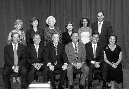 The family at the patriarch's seventy-fifth birthday celebration, June 10, 1999, shortly after the elder Bush had parachuted onto the campus of Texas A&M University in College Station. Seated from left: Neil, Governor George W. Bush, President Bush (41), Governor Jeb Bush, Marvin, and Doro. Standing: Sharon, Laura, Barbara, Columba, Margaret, and Bobby Koch.