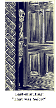Advanced last-minuting: When your opponent comes to pick you up, answer the doorbell in your bathrobe, your hair tousled. Rub your eyes, squint at the morning light, and croak, "That was today?" (Extra points for wearing a nightcap.) Or, in perhaps the most outrageous--but proportionally rewarding--of all last-minute ploys, when your opponent arrives, invite him into the house, lead him to the kitchen, turn on your heels, and cry, "Who's for pancakes?" (Extra points for wearing an apron.) The prospect of cracking eggs and pouring circles of batter onto a griddle--let alone the melting butter and maple syrup--is worth two-up in match play and three strokes in medal. This is the proffer alone! If you actually make the pancakes, the potential is probably unlimited, but speculation will have to suffice because, as of this writing, the pancake ploy has never been taken that far. Caveat: For some reason, French toast isn't nearly as effective.