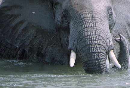 When we reached the foot of Lake Malawi, where the immense inland sea drains away into the forest, we set out in a canoe across the lake's principal outlet, the Shire River. As we bent against the midstream current, an elephant emerged from the forest on the far shore and waded ponderously into the water. Behind her came a procession--ten, twelve, eighteen elephants--all swimming now steadily toward our flimsy canoe. The matriarch faced us, raising her trunk in warning, as the herd passed; and then she too swam on to the shore we had just left. We caught our breath. We had nothing to fear. Like us, they merely wanted to cross the river.