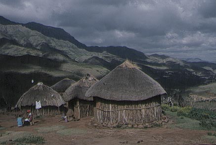 At last we reached the Valley of GaModjadji in what is now South Africa, and there in the head kraal of the Lovedu people Queen Modjadji V received us in a formal audience. (We didn't photograph her because her image is considered sacred; but she did look a little like the medicine woman of Great Zimbabwe.) Wearing the royal leopard skin, she sat grandly upon her throne--a red leatherette La-Z-Boy recliner--and uttered cryptic messages for us to convey to the western world. Days later, as we rested in this similar village in Lesotho, we still puzzled over the meaning of the great Queen's oracle.