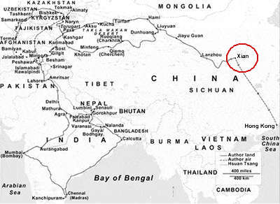 To begin your photo tour, click on the beginning of the voyage, the city of Xian in northeast China, above Hong Kong.