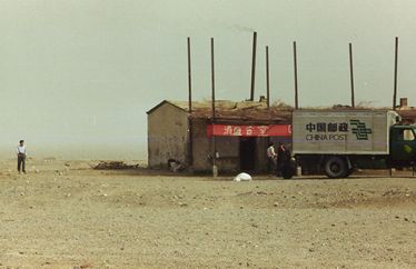 "On our last, long leg back to Xian, on the road between Qiemo and Ruoqiang we stopped at a roadside eatery and had "pulled" noodles for lunch. The place was run by a Uigur woman in a red dress and a blue kerchief who