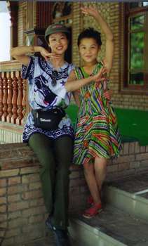 | "Turfan is a major destination of the ancient silk road, the site of two major archeological ruins where Hsuan Tsang was received in a grand welcoming ceremony by the local, devoutly Buddhist king. From Ultimate Journey: 'We know from cave-temple wall paintings what the scene must have looked like. The members of the court dressed in flowing robes belted at the waist; they had curving mustaches and flowing beards and high conical headdresses held in place with silk chinstraps The ladies, who included the queen, were resplendent in their brocades, their bangles, their jade pins, bracelets, and hairpieces. A thousand faces glowed in the light of a thousand torches that illuminated the desert poplars and the peach and apricot and almodt trees, while all around the opaque night stretched to the horizon.' We saw seventh-century mummies in Turfan and we made friends with some Uighur girls whom we found dancing in the local park." |