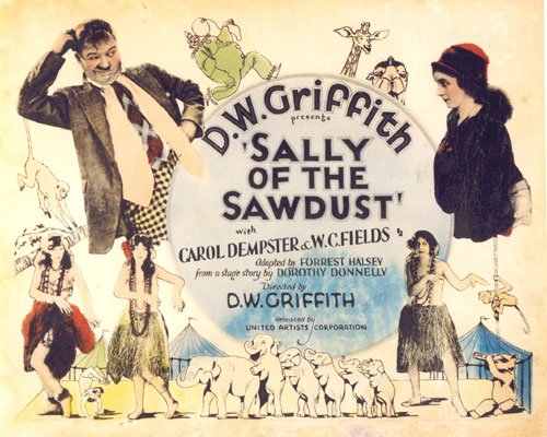 4. The first feature film in which W. C. Fields received star billing was D. W. Griffith's 1925 production of "Sally of the Sawdust." Based on Fields' stage success "Poppy," it marked the beginning of his career in silent features. "Sally" was produced by Famous Players-Lasky as a Paramount Picture but, as this title lobby card shows, it was released by United Artists, which still had a claim on Griffith's services.