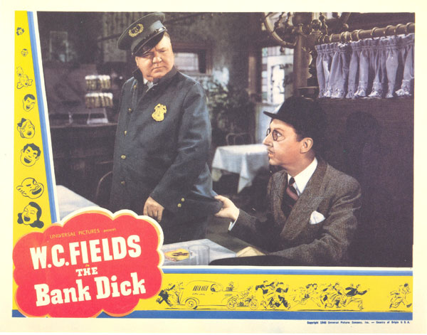10. At the age of 60, Fields pulled off a late masterpiece with "The Bank Dick." He wrote the original story and much of the script, taking screen credit as Mahatma Kane Jeeves. Franklin Pangborn appears in this original lobby card from the film's 1940 release. Also in the cast were Cora Witherspoon, Una Merkel, Evelyn Del Rio, Jessie Ralph, Shemp Howard, Richard Purcell, and the wonderful Grady Sutton.