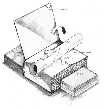 - Proceed to the next edge that needs repair. You may want to turn the book as you work on it, but always keep the paper-towel tube under the cover to keep it away from the textblock.