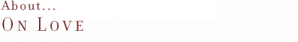 Secular love, sacred passion. Many of the poems in On Love meditate on what Keats calls "the holiness of the Heart's affections." These poems--some written in a version of my own voice, some speken by a gallery of historical figures--anatomize different aspects of eros. They take up the subject of human interconnectedness, of separation and fusion, autonomy and blur. "The Beloved and I are One," as the Sufi maxim has it. "We are creative creatures fuelled by passion," my Colette says. Sometimes that passion seems to drive us apart. Other times it brings us together as one.