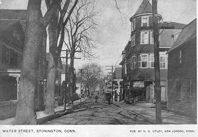 Turn-of-the-century view of Water Street in Stonington. The house JM bought is on the right, its turret containing the pressed-tin dome over the dining room table at which he and DJ sat for sessions with the Ouija board.