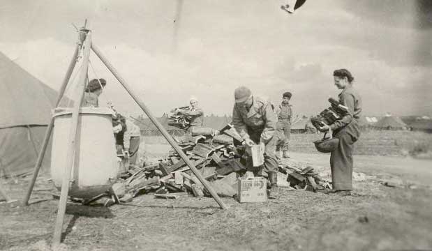 10. Nurses of the 93rd Evacuation Hospital gather firewood for their tent stoves on "Hell's Half Acre," as the Anzio beachhead hospital compound was nicknamed by American GIs. View photo