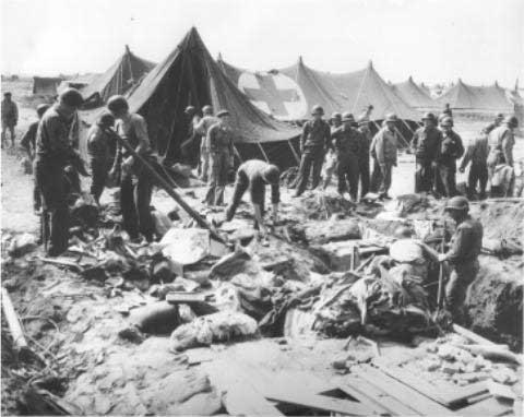 11. Hospital personnel examine the damage done to the hospital area on Anzio beachhead by German shells. View photo