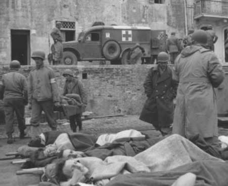 12. U.S. Army corpsmen carry wounded soldiers to a dockside area for evacuation from the Anzio beachhead on 31 January 1944. View photo
