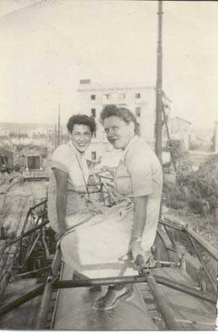 13. After a German retreat, Lt. Evelyn Anderson and Vera Sheaffer, nurses from the 93rd Evacuation Hospital make themselves comfortable on the large German railroad gun that U.S. soldiers nicknamed "Anzio Annie," "Anzio Express," and "Whistling Willie." View photo