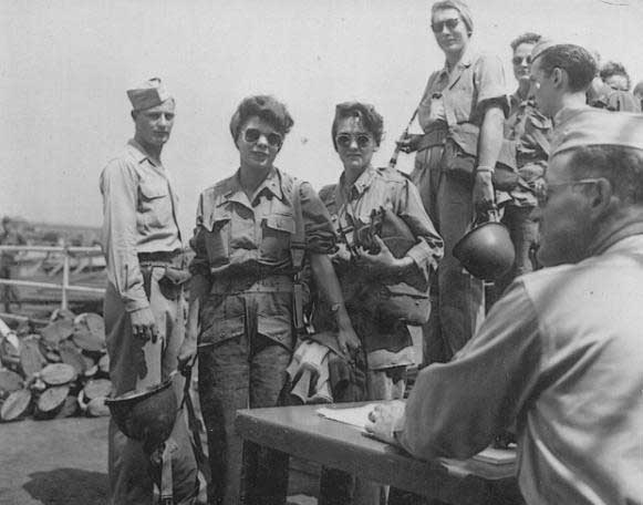 14. U.S. Army nurses of the 95th Evacuation Hospital, Bee Wee Wheeler, Fern Wingard, and Anna Mae Ziegler board the USS Marigold in Naples, Italy for the invasion of southern France. View photo