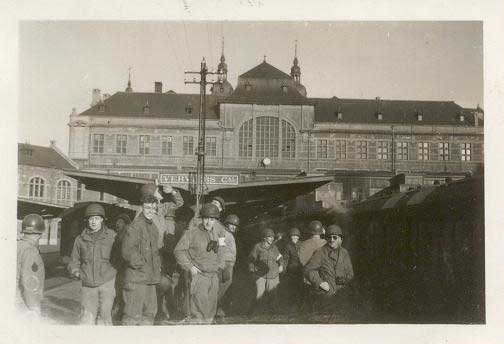 15. A U.S. Army hospital train crew emerging from shelter after a strafing attack at Verviers, Belgium, winter 1944. View photo