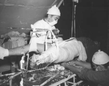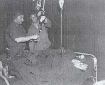 17. Capt. Jack Gurwitz, Boston, MA operates on a patient suffering from a compound fracture of his thigh and injuries to his blood vessels. Amputation was necessary because of gangrene of the foot. The American National Red Cross shipped the blood used in transfusion from the United States. Helping Capt. Gurwitz is Tech 5 Vincent Luther, Patton, PA (lower right) of the 93rd Evacuation Hospital, 7th Army, 7 November 1944 in Plombiers, France. View photo