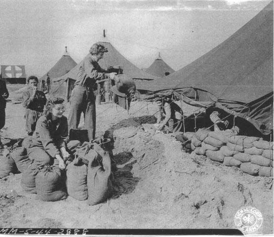 8. U.S. Army nurses fill and place sandbags around their living quarters in order to provide better protection against German bombs and shrapnel. View photo