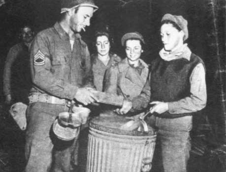 9. U.S. Army nurses line up with other soldiers to clean their mess kits after a quick meal on the Anzio beachhead. View photo
