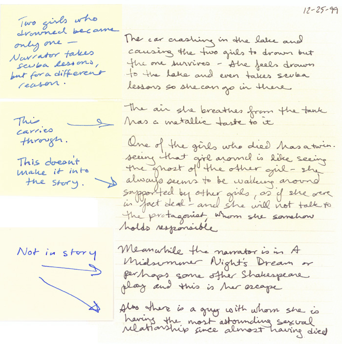 These are the first notes Julie mde for the story "The Isabel Fish," She's marked things that made it into the finished story in some way or another, but as you'll see, almost everything changed.