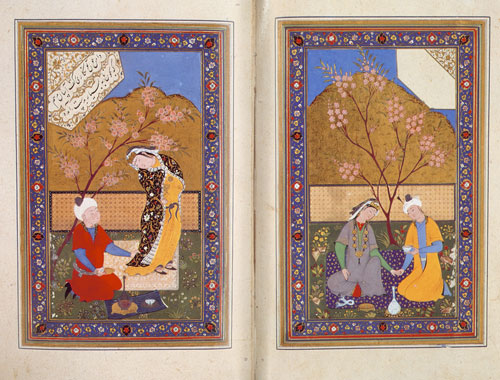 "Look at this, I said much later, once again unable to refrain from showing them a masterpiece--this one could've belonged in any collection of ghazals, which spoke of love, friendship, spring and happiness. We looked at the trees of springtime blooming in an array of color, the cypresses in a garden reminiscent of Heaven and the elation of the beloveds reclining in that garden as they drank wine and recited poetry; it was as if we in the moldy, dusty and icy Treasury could also smell those spring blossoms and the delicately scented skin of the joyous revelers..."