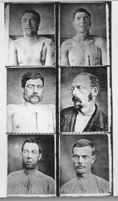 This composite photo shows the outlaws who were captured or killed. Clockwise from top left: Clell Miller, killed at Northfield; William Stiles, alias Bill Chadwell, killed at Northfield; Cole Younger, captured near Madelia during the escape; Bob Younger, captured near Madelia; Jim Younger, captured near Madelia; Samuel Wells, alias Charlie Pitts, killed near Madelia.