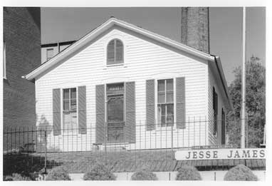In 1881, Governor Thomas T. Crittenden devoted much of his inaugural address to a virtual declaration of war against the outlaws. "No political affiliations," he baldly stated, "shall ever be evoked as the means of concealment of any class of law-breakers." He convened a meeting of executives of the express and railroad corporations (who for once took an interest in capturing the outlaws), and raised far more money for a reward than could be legally offered from the state's coffers. Meanwhile, Jesse's followers rapidly fell away--either arrested or murdered in internecine feuds. On Christmas eve of 1881, Jesse moved his wife and two children into this humble house in St. Joseph, Missouri (the building was relocated before this photograph was taken). Soon they were joined by Bob and Charley Ford. The Fords were the last two members of his gang, and they had already made a deal with the governor to assassinate Jesse for the reward (though Crittenden would later deny that he had agreed to the murder). On April 3, 1882, they finally found Jesse at his most vulnerable: his revolvers tossed aside, his back turned.