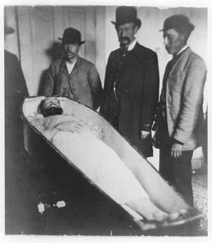 Here Jesse's corpse lies packed in ice, prior to his burial. At the end of his life, he grew his beard and died it black; it proved to be sufficient as a disguise, even though he lived in St. Joseph, a short distance from his childhood home. On the right side of his chest, two deep scars show where he was wounded in the Civil War, first in the summer of 1864, and again (and more seriously) in May 1865 outside the town of Lexington.