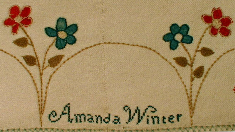 The jacket for The Age of Homespun is a chimneypiece with fishing lady motif. Boston, 1747-50. Tent stitch in wool on linen