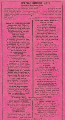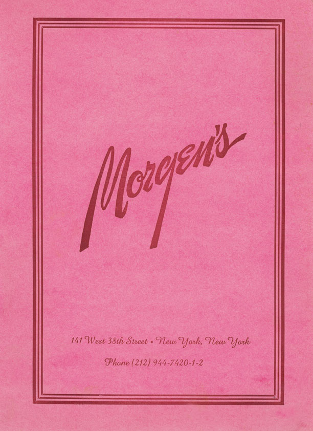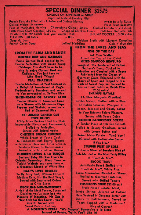 4. Menu from the 1980's. Dad wrote poetry every day. Sometimes he did it on the menu. His name for chicken soup? "Essence of Young Fowl with Matzoh Dumpling". Morgen's was the first restaurant to serve chopped salad in New York.